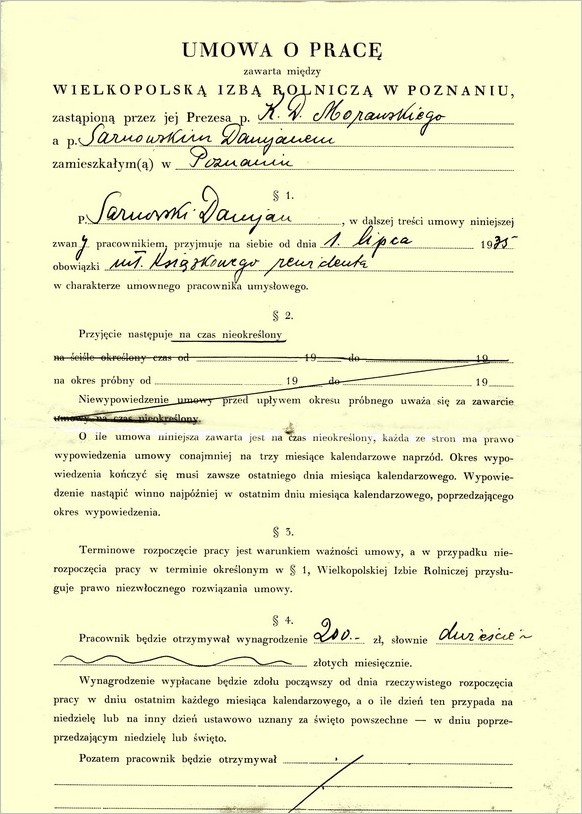 w Wielkopolskiej Izbie Rolniczej, zamieszczamy skany umowy o pracę i legitymacji pracownika Izby. Pan Damian Sarnowski był początkowo