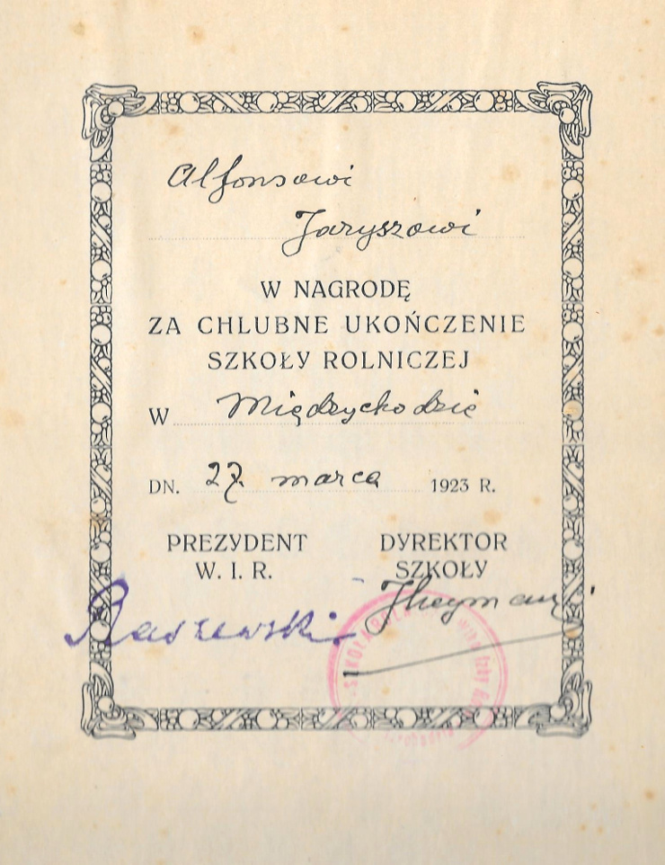 Nagrodę za “chlubne ukończenie szkoły rolniczej” w Międzychodzie otrzymał w roku 1923 Alfons Jarysz.
