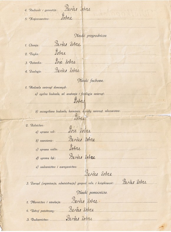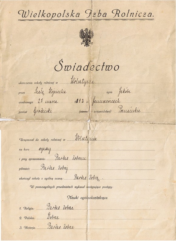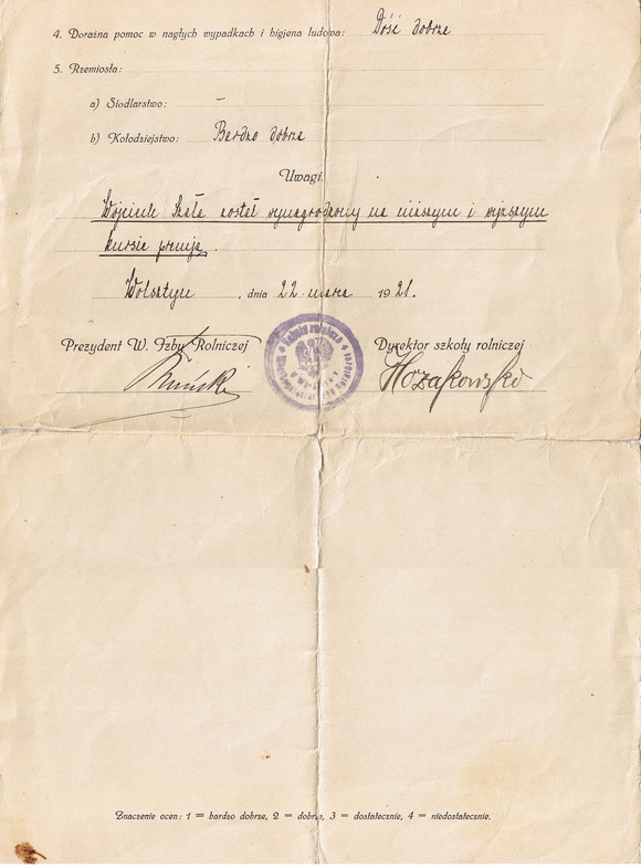 Oto pochodzace z roku 1921 świadectwo ukończenia Szkoły Rolniczej w Wolsztynie. W roku tym opuścili szkołę (założoną w 1919) jej pierwsi absolwenci. Świadectwo zostało podpiasane przez prezydenta Wielkopolskiej Izby Rolniczej - Adolfa Bnińskiego i pierwszego dyrektora szkoły - Mariana Hozakowskiego.