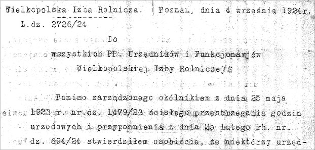 Izby Rolniczej z września 1924 roku w sprawie poprawy dyscypliny pracy pracowników.